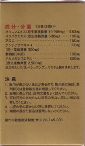 | 有効成分・分量 | (3個中) オウレンエキス 3.63mg 黄連 19.965mg アロエ 150mg ゲンチアナエキス-T 60mg ゲンチアナ 300mg オウバクエキス 100mg 黄柏 500mg 動物胆(牛胆) 100mg アカメガシワエキス 250mg 赤芽柏 2500mg 添加物 バレイショデンプン サリチル酸 |